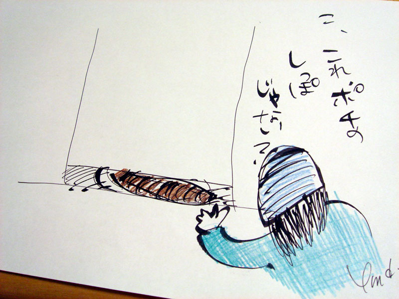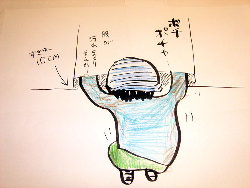 10センチの隙間から覗くとポチはこちらに背中を向けているようだった。手をいれてもシッポをつかむことしかできないし、そうこうしているとポチはじりじり奥のほうへ奥のほうへと身体を移動させていく。ホウキの柄の部分で追い出すようにすれば簡単に出てくるかと思ったがポチはこわばって重たい石のようにびくともしなかった。