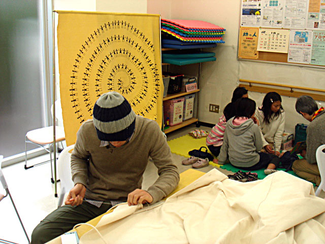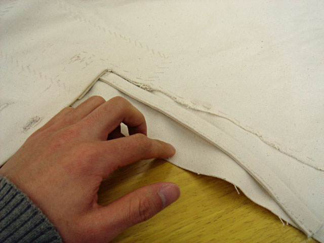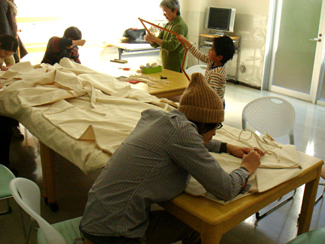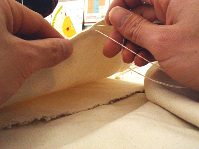 2008年もティピを作りに通います。作業的には昨年からの続き、ひたすら厚くてかたい帆布を手縫いしていく。ティピ作りというよりもはや裁縫サークルのようだけど、淡々と白い布と相対するのは意外と気分がすっきりして気持ちいい。