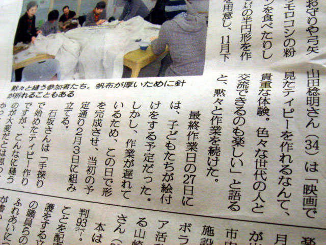 お昼からティピ作り。寒さは厳しいが天気はいい日曜日。今日も一日黙々と裁縫仕事です。それぞれの人に分担があって少人数でやっているがゆえの効率性の良さを感じました。針を一本曲げてしまった。
