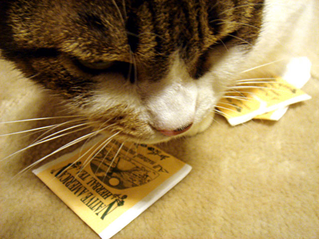 インディアン・ハーブティーを飲んでいて、そのティーバッグの包み紙にうちの猫が異様に反応してゴミ箱からくわえて居間まで持ってきた。で、拾い上げようとするとその包み紙はよだれがダラダラでビタビタになっていて、ポチはというと恍惚の表情なのだ。むむ、これはマタタビを嗜むときのポチと同じ状態だ!と思ってインディアン・ハーブティーの成分表を見てみるとさまざまなオーガニックハーブにまぎれて「catnip」の文字が。
