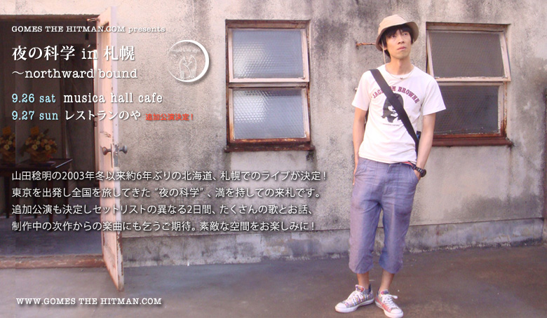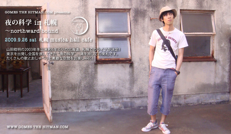 札幌で2003年以来7年ぶりのライブが決まりました。7年前は飛行機に乗り遅れそうになったりアッキーがお腹をこわしたりしたドタバタ道中だった。家族やお友達を連れてぜひ遊びにきてください。『pilgrim』というアルバムは僕を久しぶりの街に出かけさせる起爆剤のようなものになりました。今作っている“家路アルバム”からもたくさん歌うつもりです。近々秋のライブスケジュールをまとめて発表するつもりです。