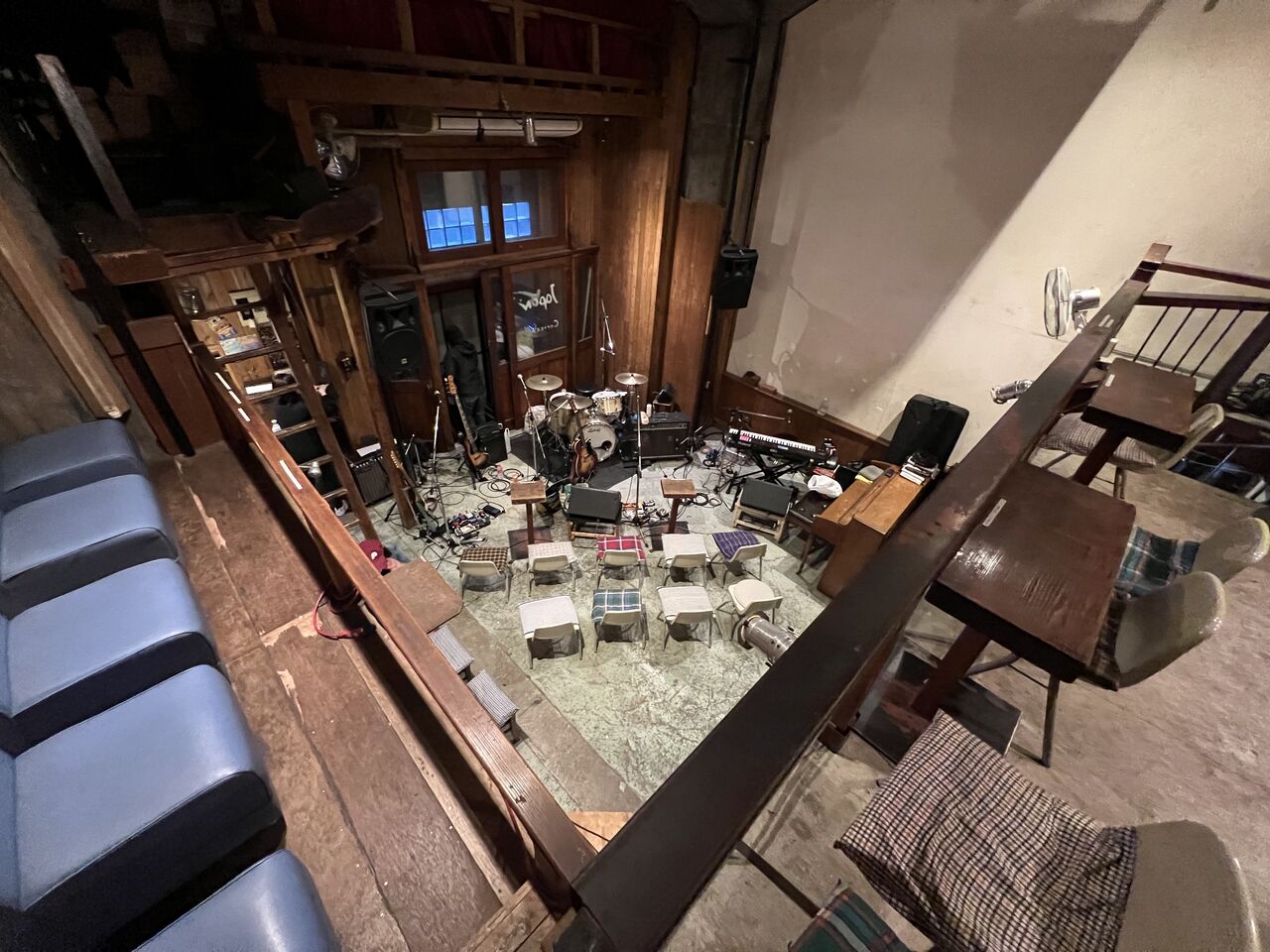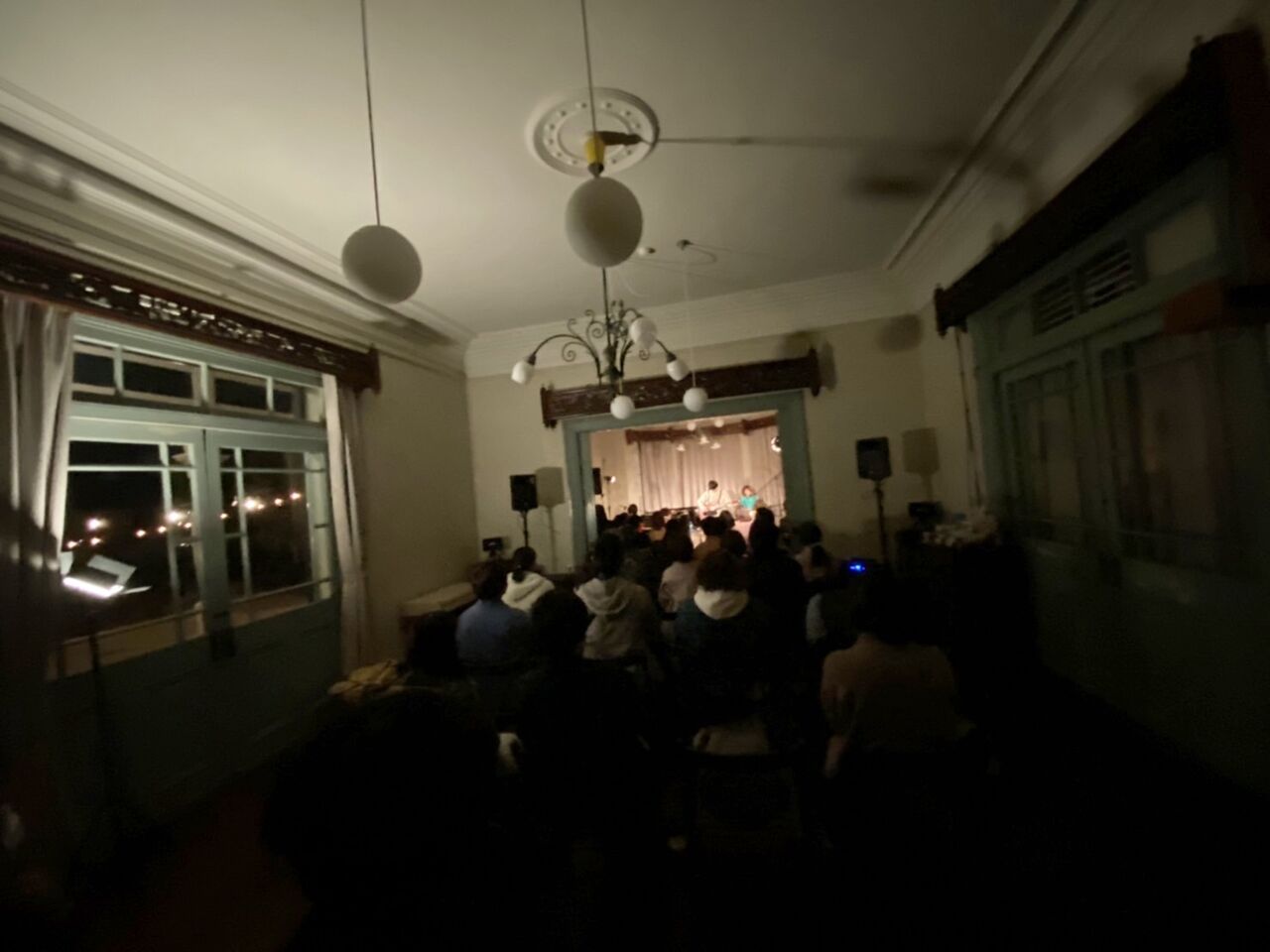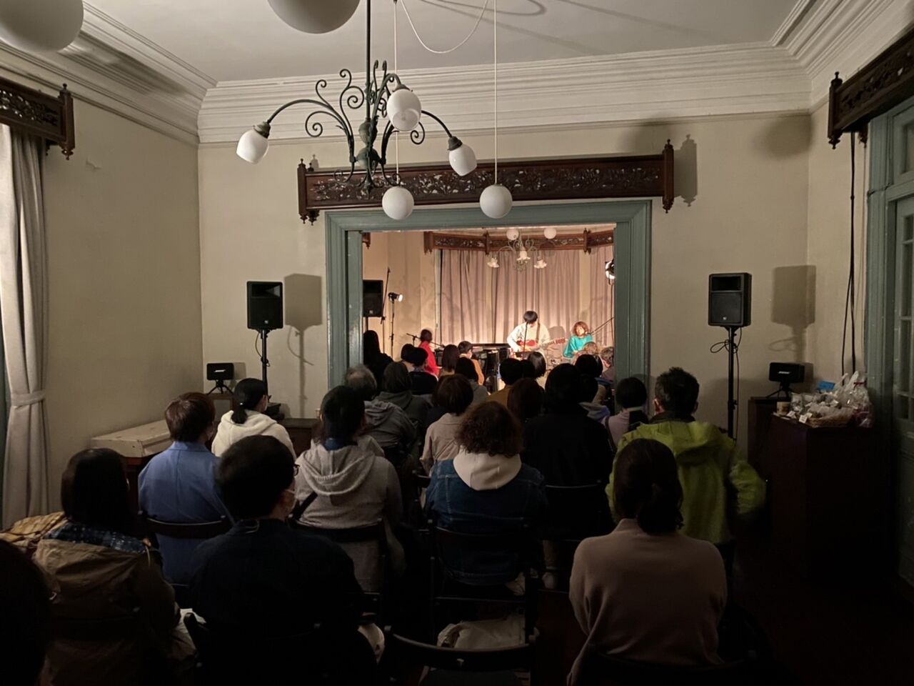 神戸の海が見えてきて俄然テンションがあがる。旧グッゲンハイム邸は2019年に下見に訪れたことがあったんだけど、その時は夜だったから印象が全然違った。海、線路、山、洋館、素晴らしいシチュエーション。ここでライブがやりたいという願いも叶ってしまう。加古川からチャッツワース家族がすでに到着していて、会場準備が進む。今回はシカゴキカク早田くんにもイベント制作のお手伝いをいただいた。線路を越えて荷物を運ばないといけないという心配事も難なくみんなで解決。この日の音響はチャッツワースでのGOMES THE HITMAN公演も担当してくれた真田さん。時間をかけて丁寧にセッティングしてくださった。僕は近隣を散歩したり2階から海を眺めたり。