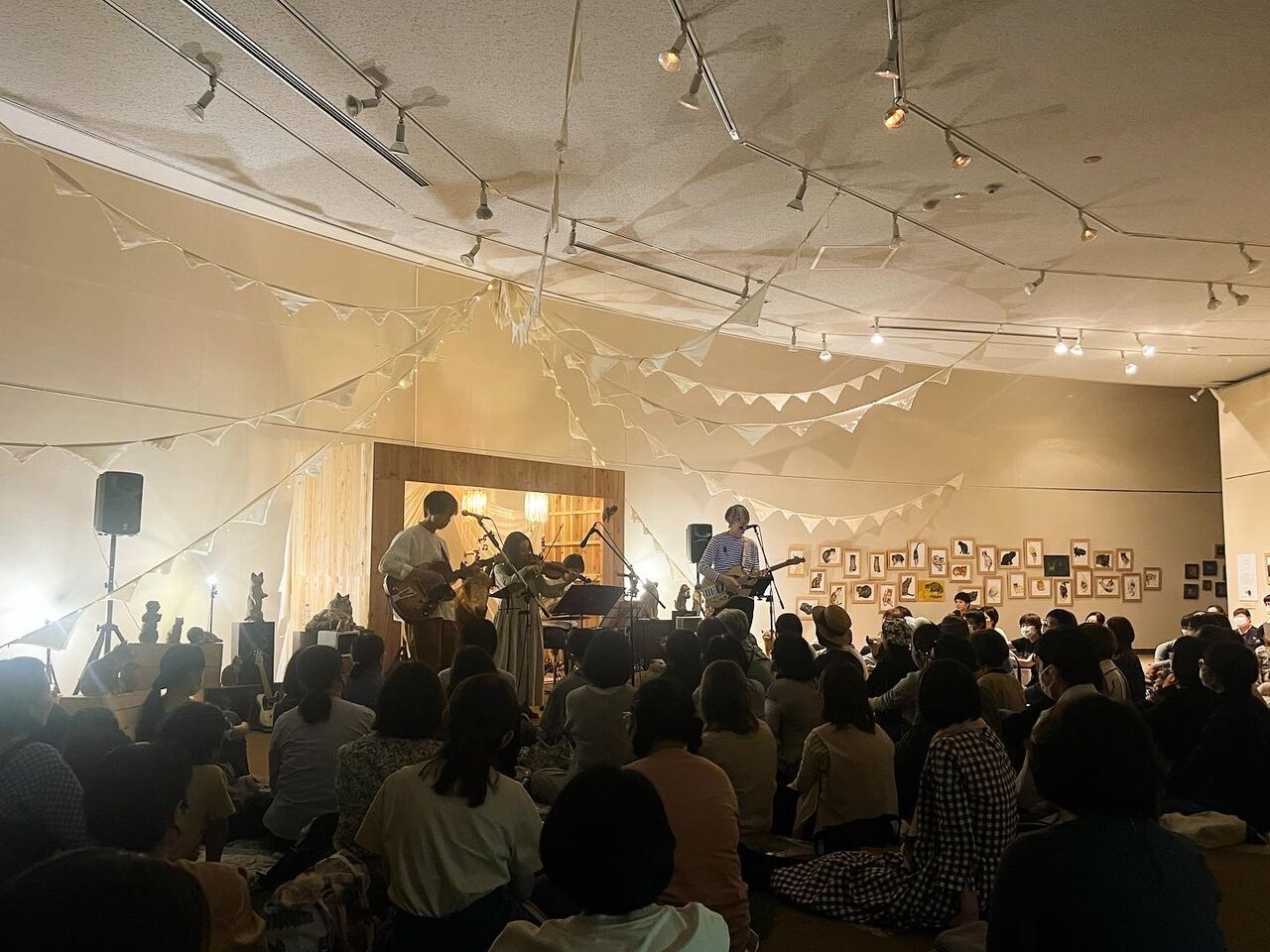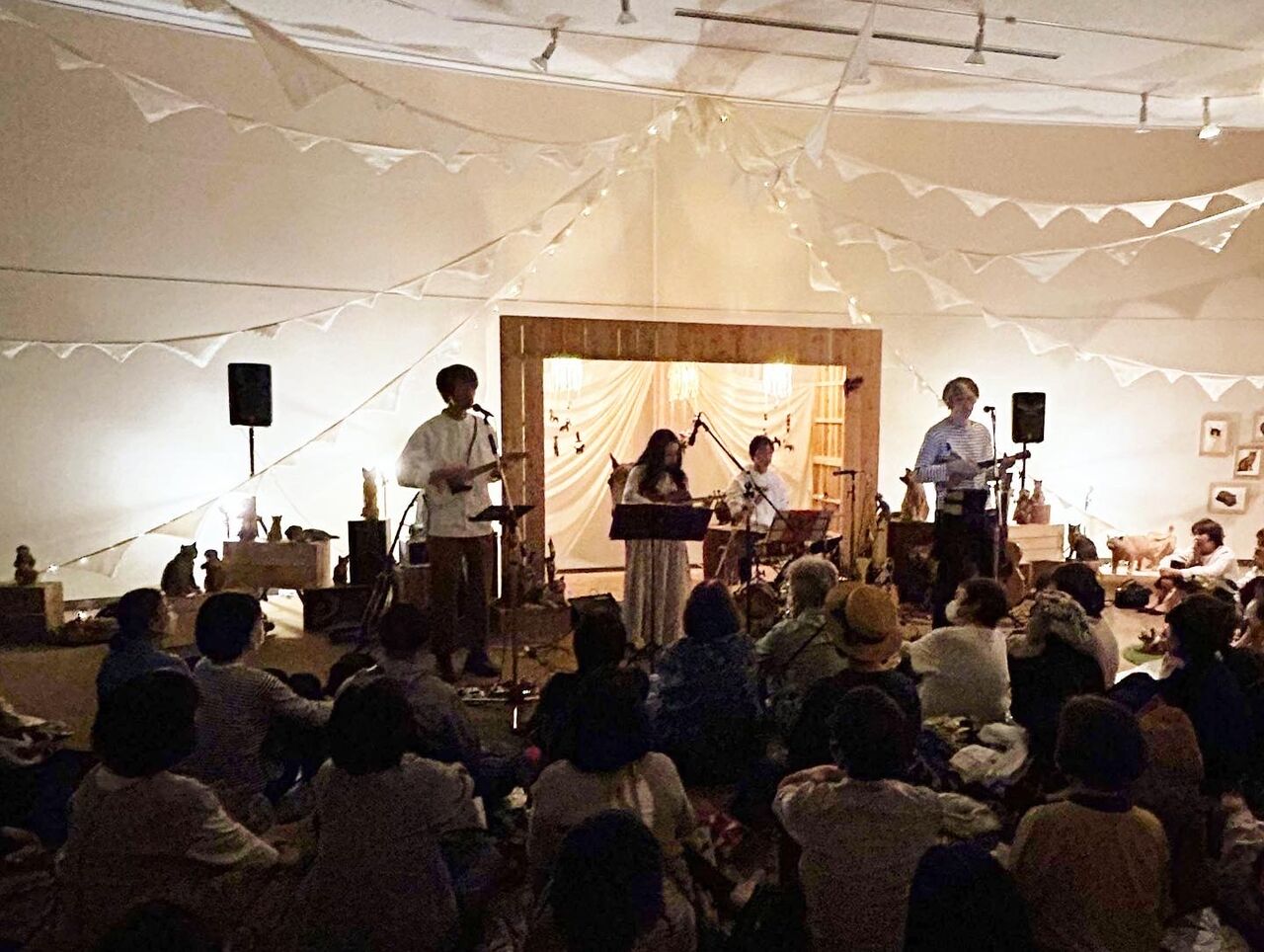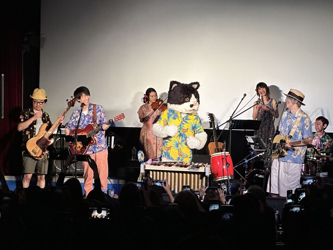 沖縄公演のわれわれ、ドレスコードはアロハ。男性陣とスタッフチームは思い思いのアロハを用意、イノトモちゃんとみおさんは華やかなリゾートドレスでした。不思議なもので、普段なかなかチョイスしないアロハって着るだけでテンションがあがるのです。満員の会場、1曲目は「猫町オーケストラ」、僕のギターと歌から始まり楽器が重なってきてドラムとベースがイン、コーラスが添えられていくワクワク。オープナーに相応しい曲になりました。時間をかけて準備をしてきた沖縄公演、2曲目は近藤さんが歌う「上野動物園準備中」。子どもの姿も多い会場がちょっとふわっとした感じがありました。3曲目むぎちゃんの「君に会いに」、ようやく沖縄のみんなに会いにこれた喜びよ。やっぱりライブは楽しい。ここで一息ついて、ホスト役むぎちゃんからメンバー全員の紹介がありました。