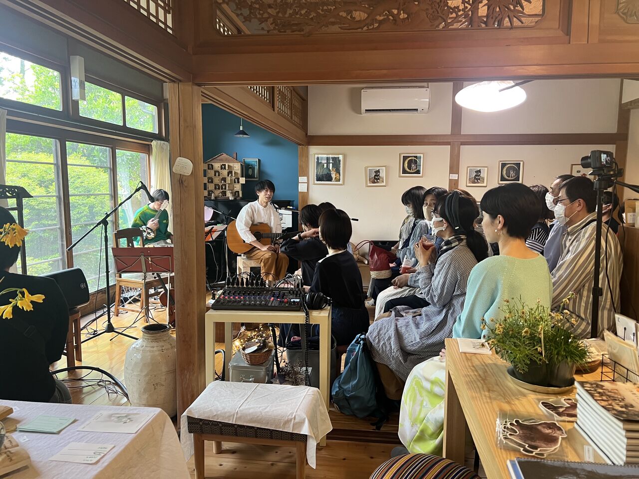 猫町フェスバンドは7人、楽器編成もマリンバやバイオリン(今回は三線も)含む大所帯なのでサウンドチェックやリハーサルがと大変。この日も初めての会場で音の感覚を掴むのがとても難しくみんな真剣。ギリギリまで調整、「先行物販始まりました」「もうお客さん並び始めました」とか「まもなく会場です」とか、時計との睨み合い。楽屋に戻ると差し入れがたくさん。むぎちゃんの家で挙げたサータアンダギー、食べ始めたら止まらない(水分持っていかれるからコーヒーが必須)。果たして2020年幻となった公演から3年越しの猫町フェスOKINAWA公演が始まります。