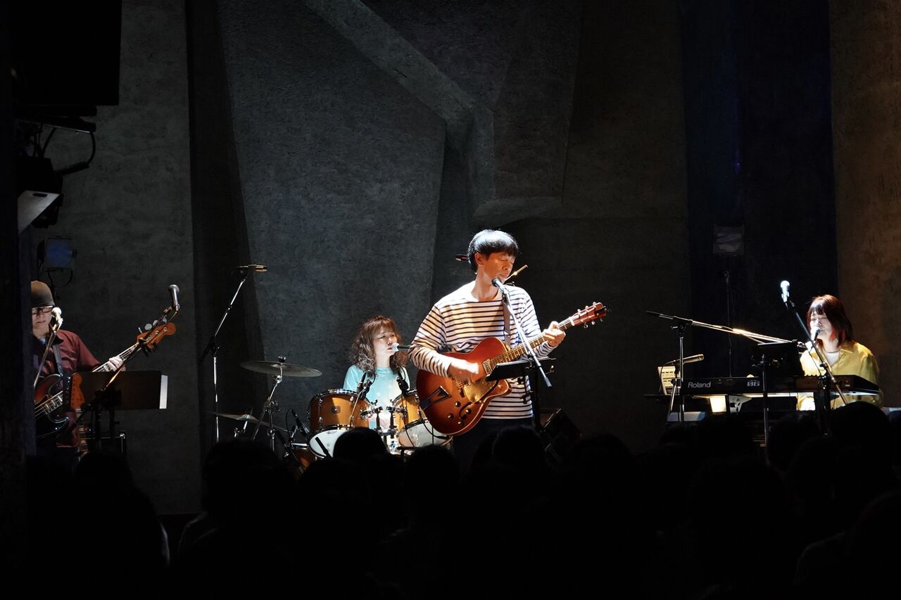 ステージは4人だけになって「小さなハートブレイク」、今度は父親に捧げた歌。「悲しみのかけら」もなくしてしまったなにかについての歌かもしれない。そう考えると『memori』というアルバムは「目盛り、記憶、思い出」についての作品なのだなと今さら改めて考えている。アニバーサリーライブが年をまたいでスライドしたことによりメジャーデビュー25周年という熨斗もついた。25年前の未発表曲として「slope song」という、いわゆるボツ曲を演奏。これは3月の下北沢レテの弾き語り公演で初めて歌った歌、バンドメンバーも初めて聴く曲だった。小気味よいギターポップ、なかなかどうして、悪くないね。