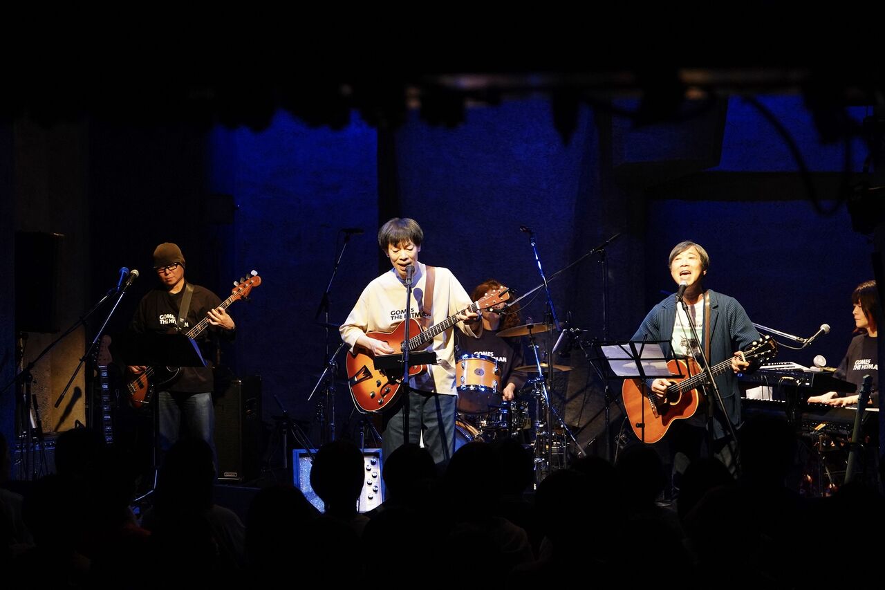 四半世紀前からタイムスリップして、昨年から毎回書き下ろしてきた新曲へ。「余韻」はもう完全に体に馴染んだ感じでグルーヴを楽しむ余裕が出てきた。続いてけっちゃんが選んだ2004年リリースの「GOLDEN8」は卒業ソングの仮面を被った別れと旅立ちの歌、この曲をレコーディングして20年になるのかと感慨深い。名阪ツアーから堀越メンバーがギターを弾くことになった新曲「blue hour」、網膜剥離後に書いた“見え方”についての歌。続いて堀越が選んだ「拍手手拍子」は2000年代前半のGOMES THE HITMANを牽引したナンバー、みんなでシンガロングできる現在、とても尊いなと思う。アコーディオンの曲をもうひとつ、新曲「新しい朝のワルツ」もみんなで歌えて楽しい。