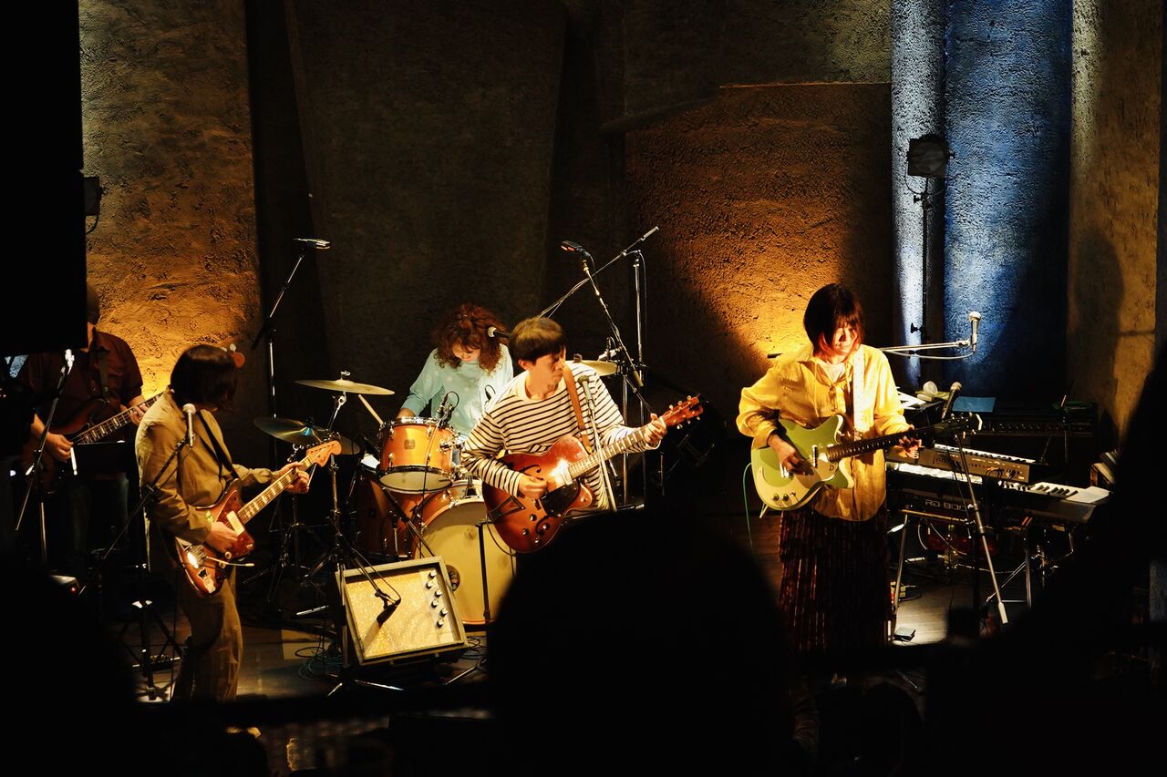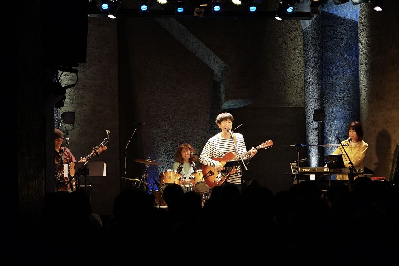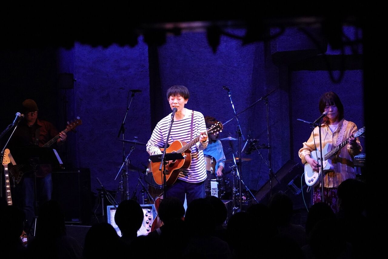 25年前のデビュー作から「tsubomi」を演奏してクライマックスへ、という前に、まっさらな新曲をもうひとつ。今回はとても苦労した。ギリギリまで書けなくて、もし新曲できなかったら「slope song」があるからいいよね、という話にもなっていたんだけど、ライブ前日に歌詞とメロディが完成して、最終リハーサルに間に合った。まだタイトルのない曲、「ディスコビートがいい」と誰かが言ったから作った。これからどうなるか楽しみ。“もう「あの頃みたいに戻りたい」なんて本当は思ってない”という歌詞が気に入っている。